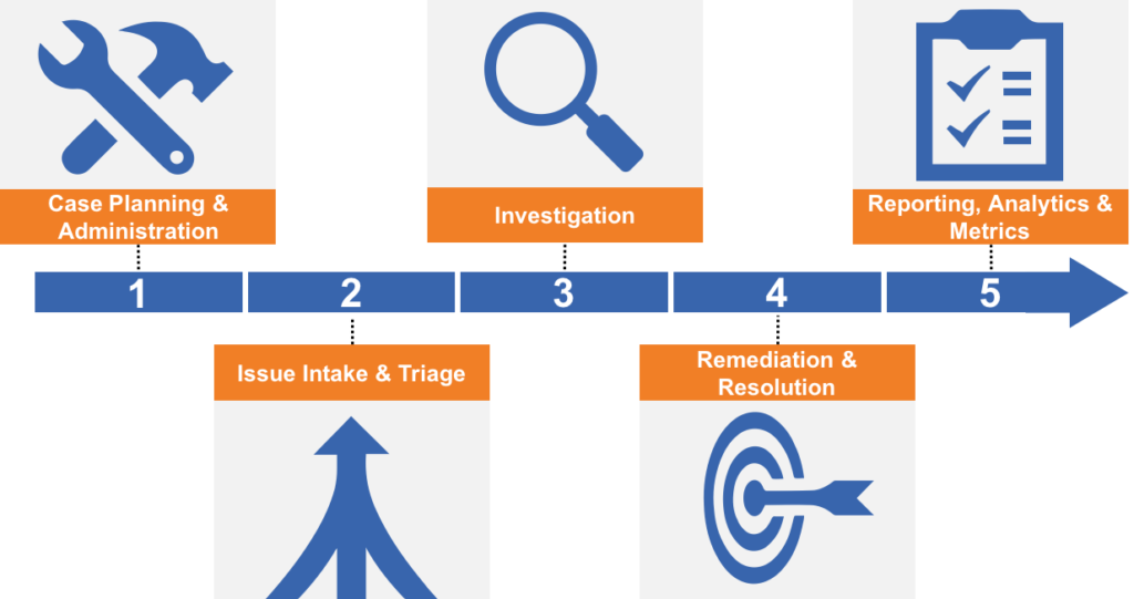 1. Strategic/operational case planning and administration.This involves the ongoing planning and administration of issues, cases, investigators, workload, and tasks. Core to this is resource and case planning and administration, the ability to measure cycles/seasonality of cases, backlog, resource planning, and costs.