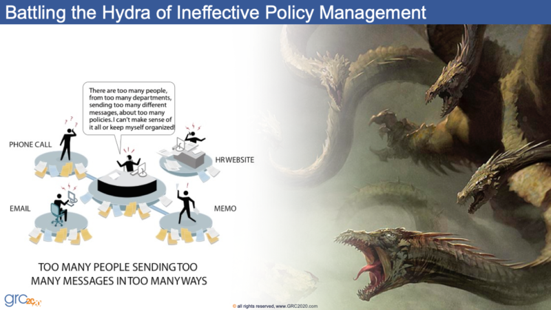 The majority of organizations do not even know what policies they have. At a conference I keynoted at there were 200 attendees in the room. I asked the audience who in the room has a master index of all of their policies across departments and knows what is an official policy . . . only 2 people raised their hand. I was talking to a global bank the other day and they are doing a policy discover process and found over 1,200 policies in North America alone and have not even finished the discover in this geography, and they still have to do discovery in other geographies. A large hospital chain that has acquired nearly 30 hospitals over the past two decades panicked when they realized they now have over 18,000 policy and procedure documents across these hospitals.