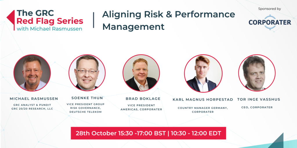 Aligning Risk & Performance Management will be the discussion we will have this week on The GRC Red Flag Series where I will be interviewing executives from Corporater as well Soenke Thun, the Vice President Group Risk Governance at Deutsche Telekom, on how to align risk management with performance management while also maintaining a strong view of risk down in the operations of the organization.