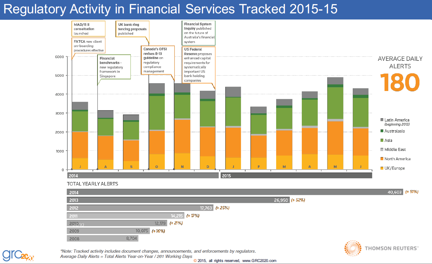 Managing this dynamic and intricate nature of change is driving organizations toward improving their approach to regulatory change management as a defined process and integrated part of a GRC strategy within the organization. Organizations are past the point of treading water as they actively drown in regulatory change from turbulent waves of laws, regulations, enforcement actions, administrative decisions, and more around the world. Regulatory compliance and reporting is a moving target as organizations are bombarded with thousands of new regulations and changes to existing regulations each year.